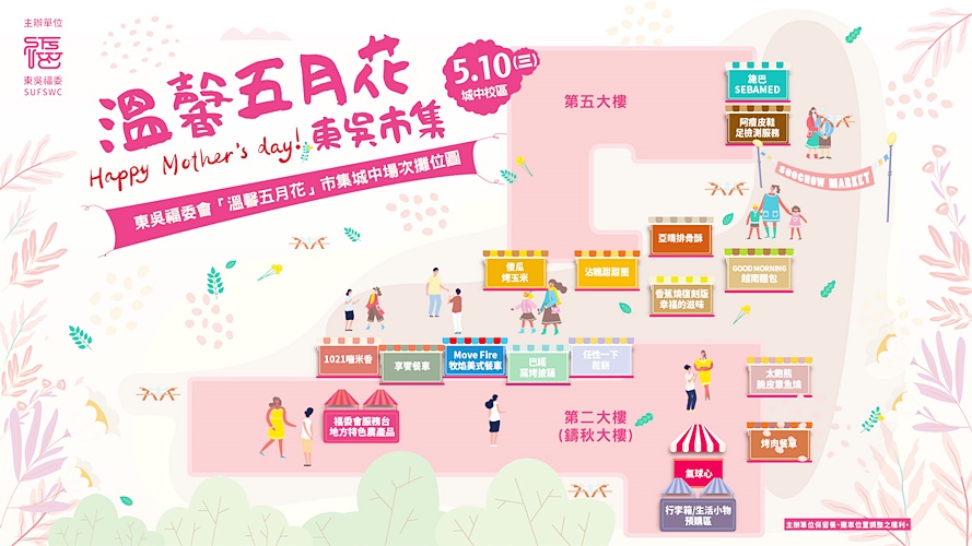 2023年母親節前夕,由東吳大學教職員工福利委員會(以下簡稱福委會)主辦市集活動分別於5月9日(星期二)在外雙溪校區、5月10日(星期三)在城中校區舉行,開放時間為上午10點至下午6點。
