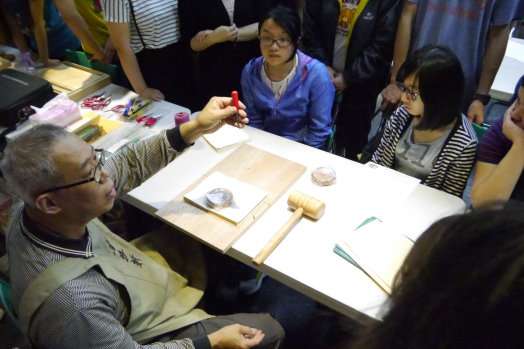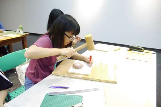 本校美育中心與人文社會學院的中華文明現代化研究暨創意中心共同舉辦書藝工作坊,在5月21日這天展開,上午是拓碑實作,下午則來到了線裝書的實作,活動尚未開始,就可以看到今天的講者吳哲叡老師進進出出,拿著許多平常難見的工具在作準備。整個游藝廣場裡就像是一個小小的工作坊,有人在拓碑、有人在作線裝書,在他們手中流動的,是中華文明的淵遠流長。