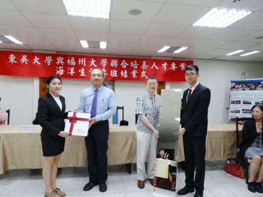 來自福州大學海洋學院生物技術專班(東福海洋生物專班)第一屆27位學生,104學年度在東吳大學順利完成為期一年的學業。105年6月14日,在同學們返回福州大學前夕,微生物學系特別舉辦簡單溫馨的結業式。趙維良副校長、理學院宋宏紅院長、姚思遠學術交流長親自蒞臨。學生們跟授課老師、助教及導師致上誠摯地的謝意,也以口頭報告及海報發表形式,展現一年來在實驗室進行小型研究的成果。趙維良副校長親自頒發專班結業證書,張怡塘主任贈送同學們東吳大學自行設計的紀念品「小書包」。同學們以穿衣鏡及自製紀念冊贈送學系,也另準備小禮物贈送導師。最後雙方互道珍重,留下美好的回憶。
