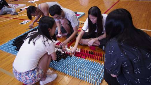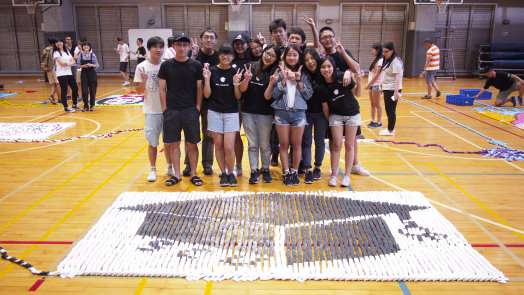 最後,3萬片的骨牌花了近三分鐘的時間才全部推倒,全場同學驚呼連連,為活動畫下完美句點。「堆疊骨牌就像是人生一樣,會越挫越勇!」這次的骨牌活動,確實凝聚了同學間的情感,也讓每位同學都帶著滿滿的笑容回家。
