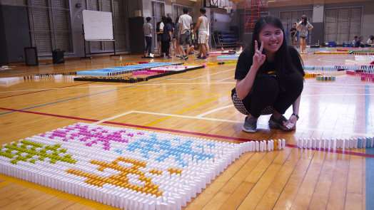 從早上8點一大群人就開始馬不停蹄的堆疊,直到下午4點半正式推倒,共排了超過3萬片的骨牌,包含10多個不同造型的圖案,像是神奇寶貝球、史奴比、蠟筆小新、城堡等,其中,還有本校校徽跟本屆畢聯會學士帽造型的會徽。