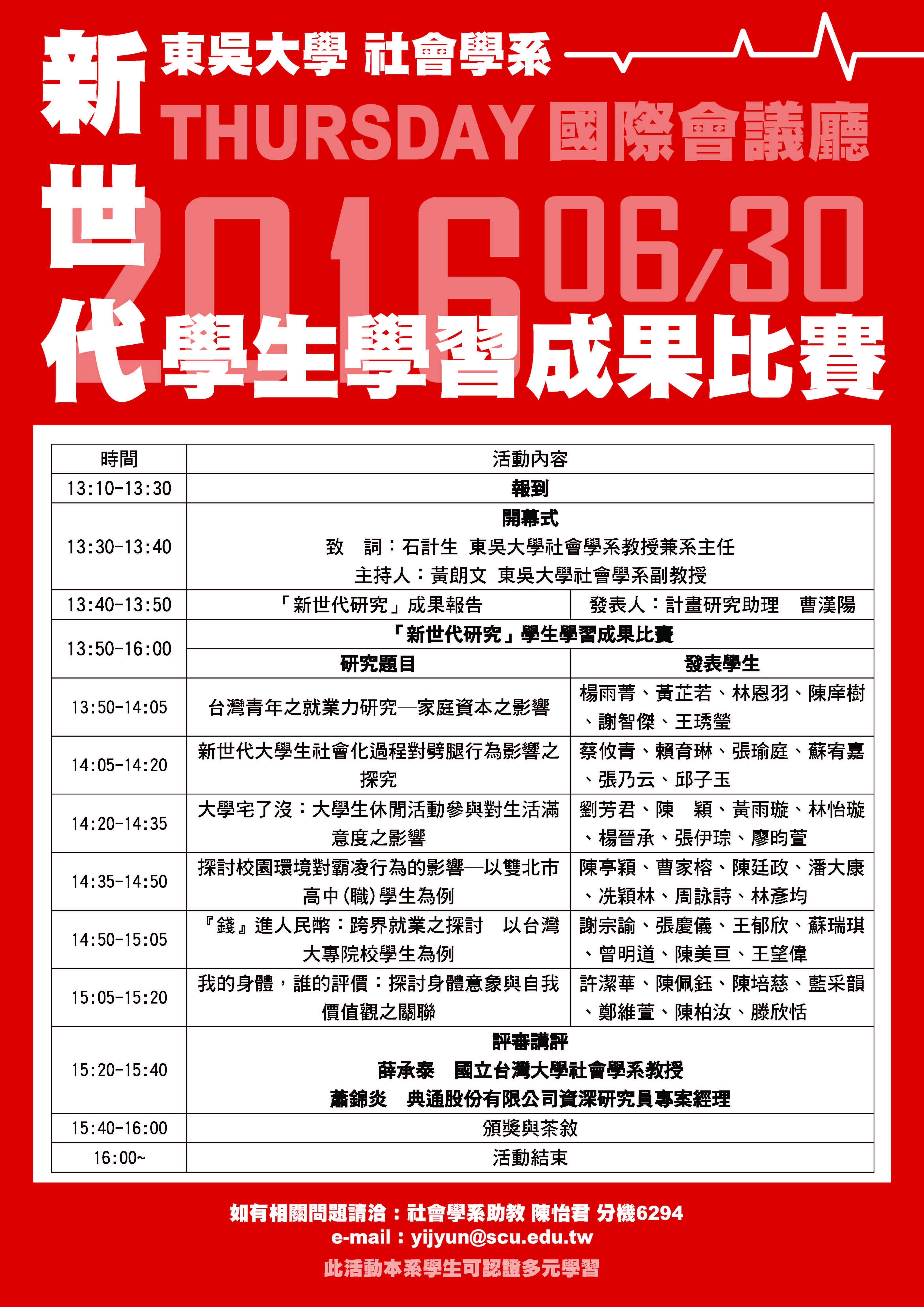 今年度社會系大三學生修習「社會研究方法」課程之111位同學進行各項研究調查,初賽計有17組學生參賽,最終6組進入決賽,分別將於會中針對就業力預測養成、跨界就業、劈腿行為、生活滿意度、校園霸凌、身體意象與自我價值等精彩議題進行調查成果發表,調查結果發表會由東吳大學社會系黃朗文副教授主持,同時邀請國立台灣大學社會學系薛承泰教授、典通股份有限公司資深研究員專案經理蕭錦炎等兩位評審評選優秀之研究報告。