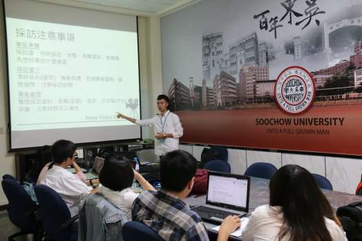 秘書室於11月19日舉辦「東吳大學校園記者培訓研習營」,活動中邀請到本校英文系歐冠宇老師及三立新聞台資深國際記者范逸華,前來傳授新聞報導的核心原則及影音製作技巧。下午的活動則是由編輯群帶領,分為影音組、文字組和英文組等課程,訓練記者群的專業能力。