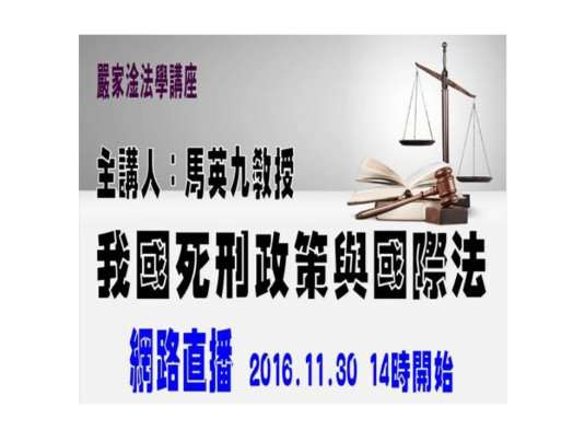 我國在2009年3月31日完成批准「經濟社會與文化權利國際公約」及「公民權利及政治權利國際公約」並通過施行法,也在同年12月10日國際人權日宣布生效,表達了我國落實兩公約的誠意與決心。但是,廢死簡單嗎?廢死是國際趨勢嗎?國內廢死條件成熟嗎?簽了兩公約就不能執行死刑嗎?東吳大學嚴家淦法學講座馬英九教授特訂於105年11月30日(星期三)下午2時至4時在本校外雙溪校區第一教研大樓一樓普仁堂以「我國死刑政策與國際法」為題發表專題演講。