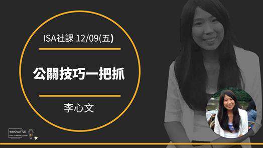 對於「公關」這個詞,大家並不陌生,在大學的社團當中,或是許多的企業部門裡,很容易可以看到「公關」這樣的一個角色存在。然而公關到底是什麼呢?身為一位公關需要具備什麼樣的技能呢?而公關這樣的角色在企業公司裡又是如何具體運作呢?12月9日晚上七點,本校的學生社團東吳創新事業協會(ISA)請到了奧美公關公司前資深專員李文心來到東吳大學,向大家介紹公關世界的樣貌,以及分享她的公關人生。