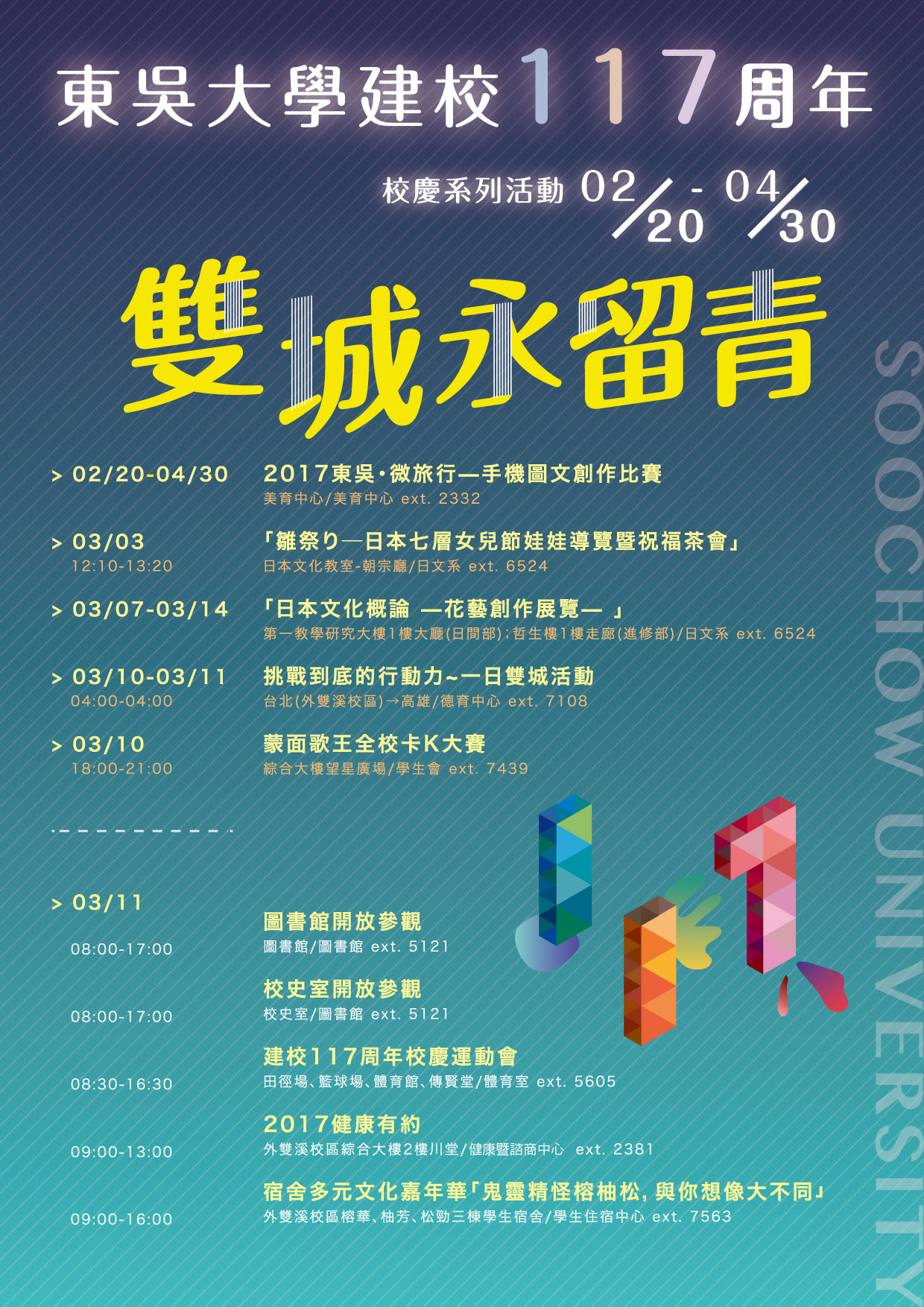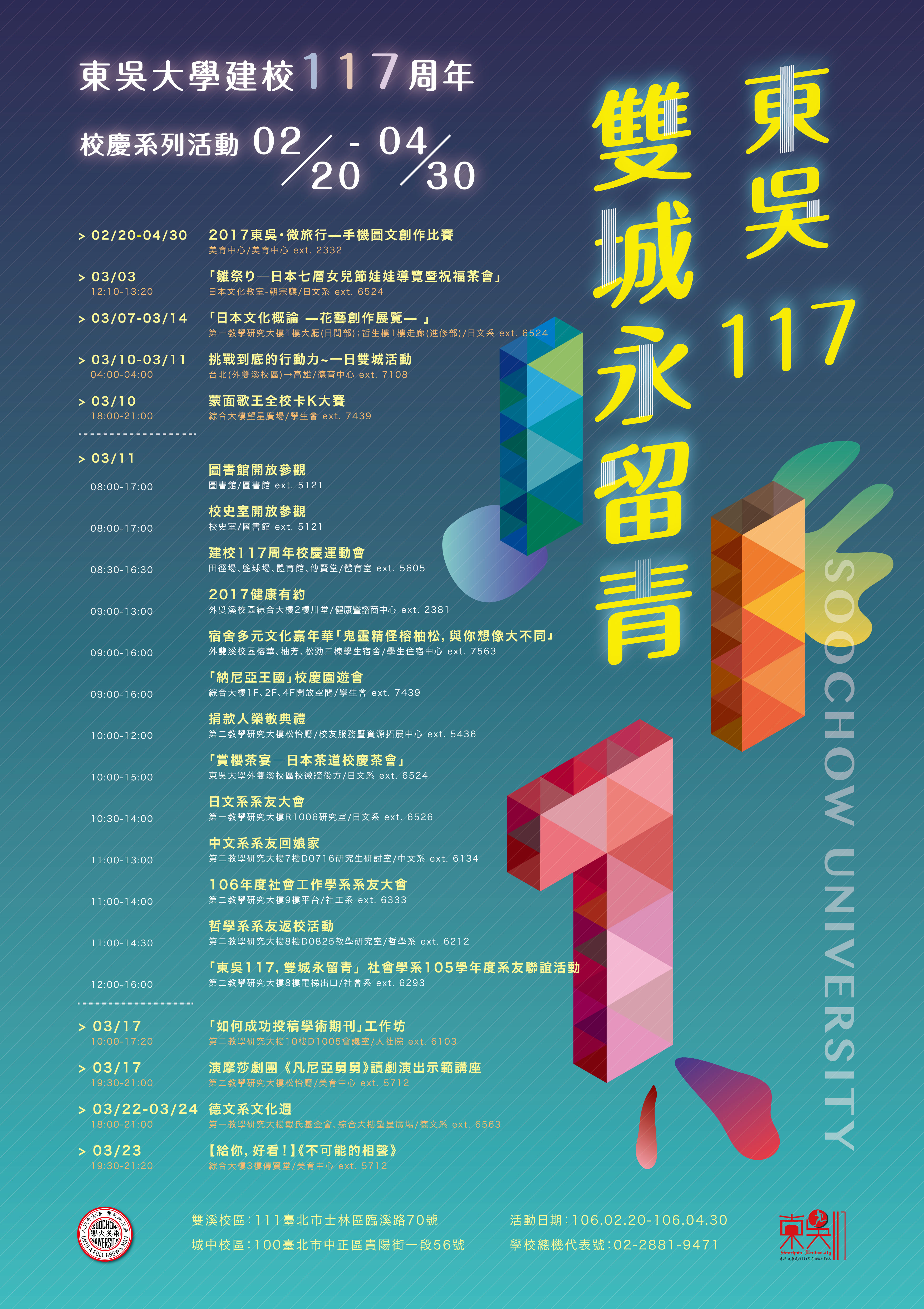 東吳大學建校117周年校慶運動會,於3月11日早上8時30分,藉由學系的創意繞場表演揭開序幕。各地區畢業校友也參與繞場盛事,凝聚彼此情誼,一同歡慶東吳大學生日快樂!