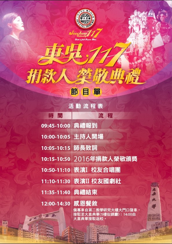 為感謝校友及各界社會賢達對本校的支持,成為東吳永續發展的後援,本校與校友總會特訂於3月11日(星期六)上午10時,舉辦東吳大學建校117年校慶暨捐款人榮敬典禮。