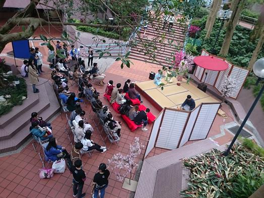 作為全國第一個創立的日本茶道社團,賞櫻茶宴活動至今已延續了將近二十年。起初舞台場景並不是現場看到的那樣,是經茶道社的創意巧思,漸漸改造成現在這個既適合戶外茶會又不失日本茶會氣氛的舞台,現場像是櫻花、榻榻米、座位上的紅布以及現場掛設的書法作品等,都是茶道代表性的佈置方式。