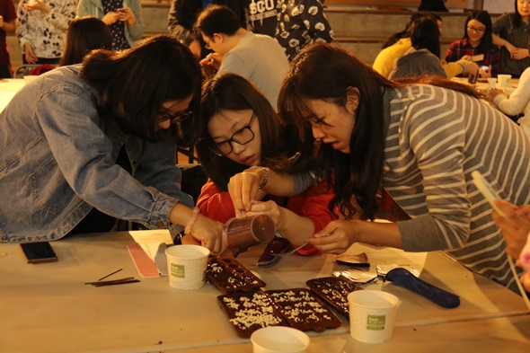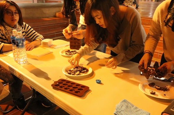活動一開始,由系學會幹部向各桌分發製作巧克力彩蛋的模具,半橢圓型的模具再倒上香氣濃郁的巧克力槳,一口一顆大滿足的復活節巧克力彩蛋便有雛形。同學們一人捧著巧克力漿,一人小心翼翼地調整模具位置,另一人不忘最後在巧克力裡放入鬆脆增加彩蛋口感的米香。團結協作後,同學們就回歸自己位置,耐心地等待巧克力凝固。
