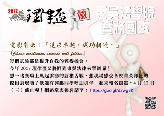 今為提供法律系所學生熟悉實務議題與練習法庭辯論之機會,積極吸引學子對重要法律議題關注,提早熟稔實務工作,亦從與他校學子之間競技交流而自我提升;且藉由共同舉辦學校工作團隊透過主辦賽務而增強主導、管理、應對的能力與責任感。特由理律文教基金會與本院簽署2017-2019年共同舉辦理律盃之合作備忘錄,此舉除更加鞏固理律與東吳法律之合作外,更盼對本院在學及未來之法律人,提供更多學習機緣,砥礪自我成長作為全觀內外、通察事理之法律人。