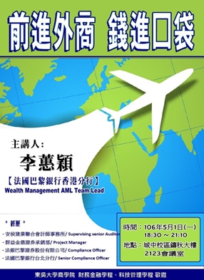 5月1日晚上,現任法國巴黎銀行香港分行財富管理部門洗錢防制團隊領導者李蕙穎回到母校東吳大學,在鑄秋大樓與學弟妹分享她在外商工作的經驗與心得。李蕙穎學姐在金融業的工作經驗豐富,曾在安侯建業聯合會計師事務所、群益金鼎證券承銷部、法銀巴黎證券股份有限公司、法國巴黎銀行台北分行等海內外知名企業任職。