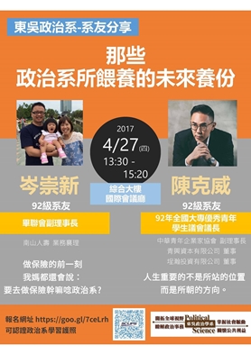 政治系畢業究竟能從事什麼行業?要從政、考公職亦或是進入企業?這是很多政治系學生內心的疑惑。為使同學瞭解政治背景對未來就業的幫助,本校政治系於4月27日邀請系上畢業校友岑崇新和陳克威學長到校演講。