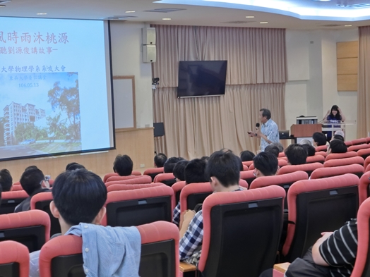 物理系巫俊賢主任握著主持棒,感念系友們一路支持,讓物理系能夠在艱難的環境中屹立不搖,持續關注大學部的教育,在系友經費的挹注下,持續完成各項教學活動。劉源俊老師亦特別製作了「春風時雨沐桃源─聽劉源俊說故事」回顧這四十幾年來物理系的蛻變,看著簡報裡的舊光景,那些泛黃的歲月啊!年輕的學弟妹們不由地驚呼連連!