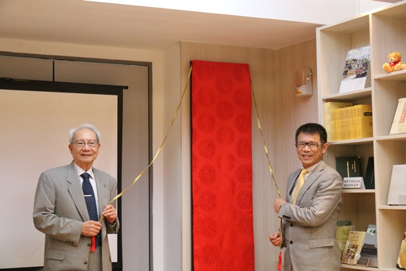 在揭牌儀式上,陶院士謙虛表示所捐書籍佔據圖書館空間,實在不好意思,感謝學校如此重視,並非常有效率地在短短一個月內將大量的書籍整理、分類、上架,非常感謝東吳行政同仁以及師長們的協助。