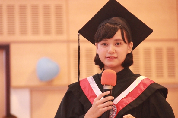 畢業生代表盧佩筠說,感謝父母,沒有他們無私地栽培、支持,不會有今日典禮台上的自己;感謝每一位師長專業科目的指引,如茫茫學海中一盞盞明燈;感謝身旁的朋友,學術切磋、生活陪伴、低潮扶持,一路走來我們竟要畢業,在生命的驛站路口互相擁抱、道別。