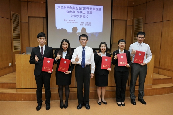 東吳創新創業基地同儕服務員授證暨參與「海峽盃」競賽行前授旗儀式於106年6月22日在城中校區5117會議室舉行,校長潘維大、主任秘書兼社資長王淑芳、商學院院長傅祖壇、企管系主任胡凱傑、生涯發展中心主任王俊雯等師長皆出席此次授旗儀式。