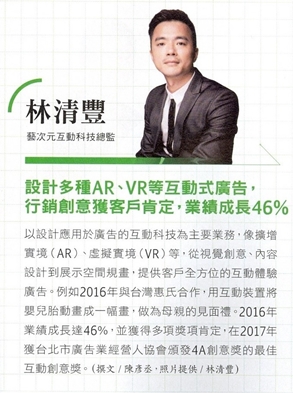 林清豐學長現為藝次元互動科技總監,甫獲得台北市廣告業經營人協會頒發4A創意獎的最佳互動創意獎。透過設計多種擴增實境(AR)、虛擬實境(VR)等互動式廣告賦予消費者充滿想像以及前所未見的商品體驗,拉近消費者與產品的距離,為行銷方式帶來了全新的改變。