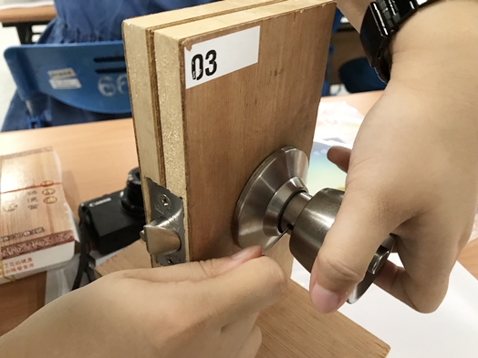 最後,講師在教導同學們如何換門鎖時,說到了如果發現家中任何金屬物件老舊時,可以使用WD40潤滑油,讓門鎖等物品重新潤滑,也提醒同學們這項產品只能用在金屬物件,不能夠用在塑膠。隨後也教導同學在沒帶鑰匙時,該如何用簡單的方法打開門鎖,同時也呼籲同學不要去做犯法的事情,為活動畫下完美句點。