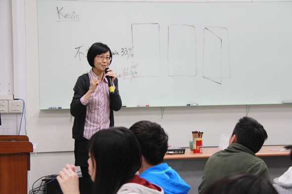 第二站是中央大學科教中心,該中心與本校物理系演喻教學發展相同,都是以整合科學教育資源、演示教具研發製作為目標。物理系77級系友、中心主任朱慶琪學姐帶領同學們瞭解實驗設計與教具製作過程中面臨的一連串疑難雜症,並啟發同學們透過不斷實驗與反覆驗證來解決問題。朱學姐透過簡單的遊戲串場,讓同學們深刻感受到生活中無處不物理,從簡單的教具中就可以發現物理世界的奧妙。她更以學習金字塔為例,表示學習不僅只有記誦,更重要的是理解、動手作,進而創新。尤其是未來的產業發展不再需要大量人力,同學們更應思考如何提高自身競爭力。