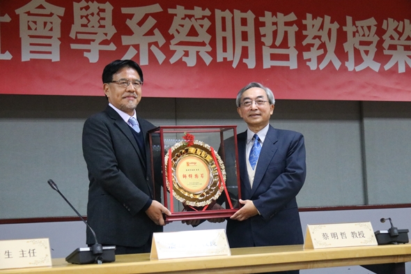 最後,由社會系石計生主任代表致贈「師鐸揚芬」感謝獎牌、潘維大校長致贈榮譽教授證書予蔡明哲教授,此外,現場還有系友獻唱李白的詩歌表達對蔡老師的感謝,更有系友寫了首七言絕句獻給蔡老師,茶會在全體師生與蔡明哲教授溫馨合照中圓滿落幕。