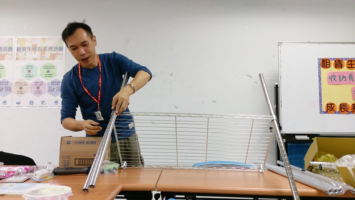 最後,陳規劃師和同學介紹能調整隔層高度而能作為衣櫃、曬衣架、電視架、置物櫃等多種用途的鍍鉻架,也親自示範如何組裝。在組裝的同時,陳規劃師更是一邊分享保養的小撇步,就是以銅油擦拭除鏽。此外,他特別叮嚀同學,除鏽的時候不建議使用市面上的除鏽劑,因為該產品的成分是以磨石粉為主,是不可逆的物理反應,通常會剝蝕物體表面,容易導致物體表層愈來愈薄而損壞。