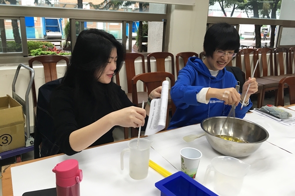 曾經參與東吳國際志工社服務的wuby老師,以輕鬆幽默的方式深入淺出地向同學們介紹製作手工皂的基本流程,如「油+鹼+水=皂」以及橄欖油、椰子油以及棕櫚油各自的效用與皂化價等知識。製作手續並不複雜,同學們大多順利打皂,更有組別用肉桂暈染,製作出特別花紋顏色的肥皂。