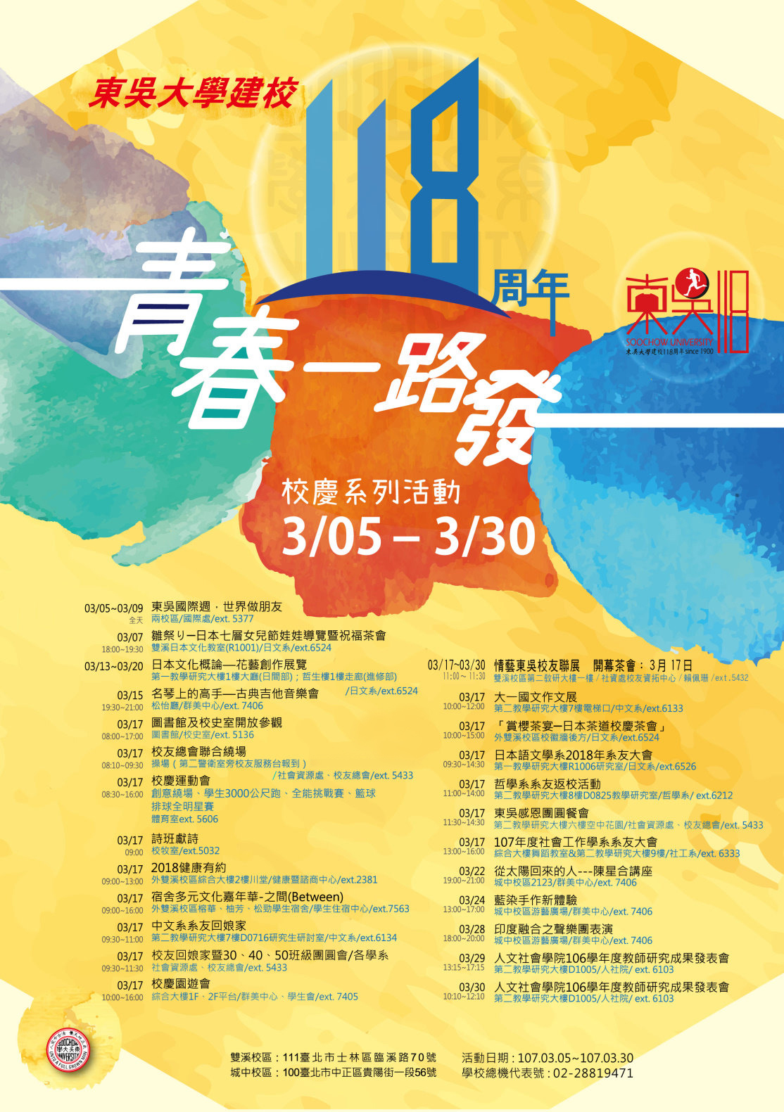 為歡慶東吳大學118歲生日,舉辦各項精彩活動歡迎大家前來共襄盛舉,一同祝福東吳大學生日快樂!