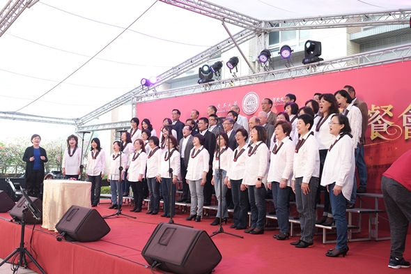除了音樂系校友帶來的精彩演奏外,台灣合唱中心的蝦米視障人聲樂團也來到現場,帶來「用聲音看世界」系列表演,與會貴賓們掌聲如雷,好評不斷;此外,商學院傅祖壇院長、會計系李坤璋主任與財精系詹芳書主任也都獻上精心歌唱表演,特別的是南加州校友會經濟系72級陳鳳桃前會長、法律系70級孫善泰會長夫人馬文綺學嫂更聯袂獻唱,引起觀眾熱烈迴響;「國道雙雄」中文系鍾正道主任及劉玉國老師也一同於台前演唱,現場氣氛歡愉熱鬧。