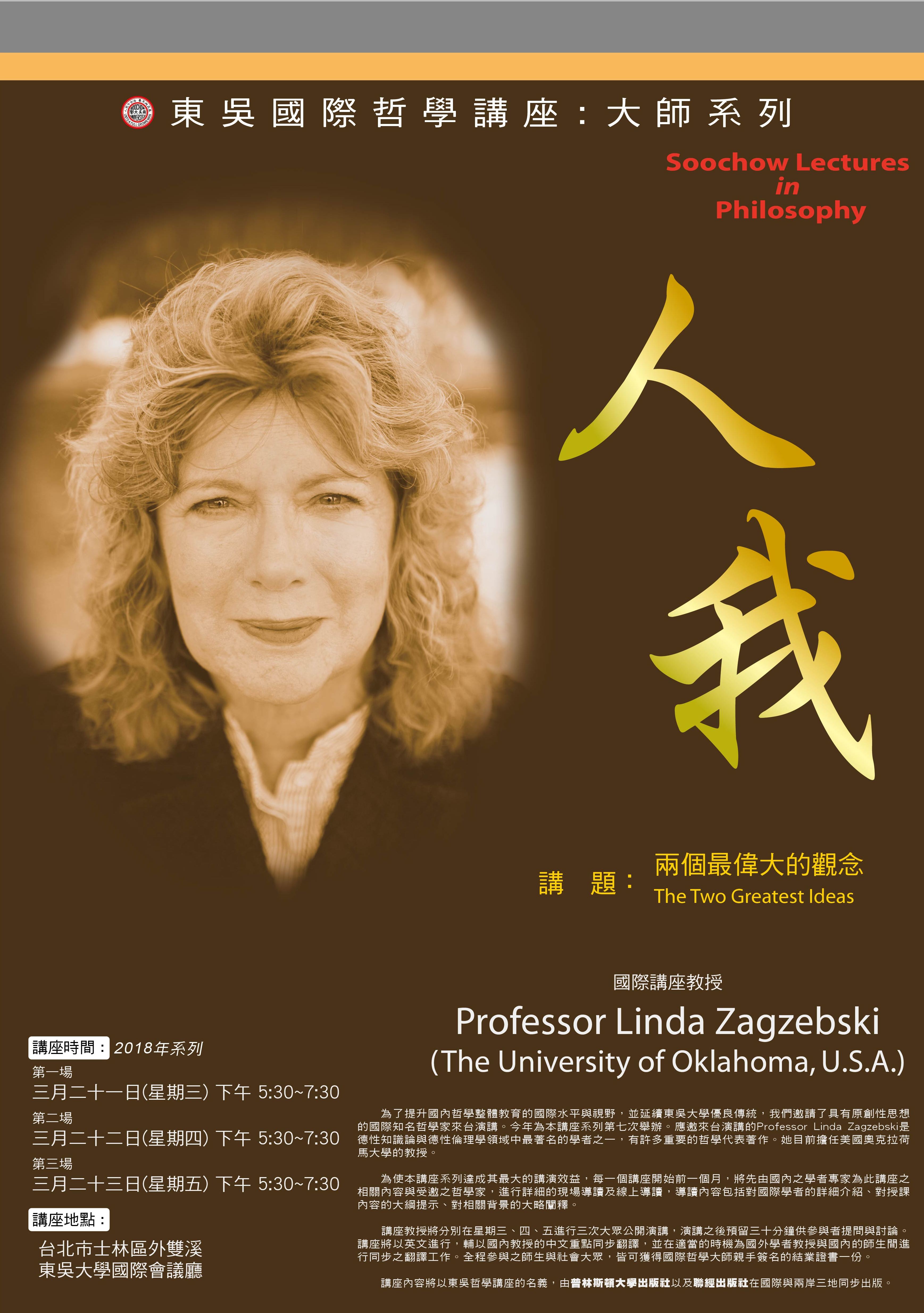 今年為第7次舉辦東吳國際哲學講座:大師系列,將邀請任教於美國奧克拉荷馬大學(The University of Oklahoma)國際知名學者Linda Zagzebski教授來台,講題為The Two Greatest Ideas(兩個最偉大的觀念)。教授將進行3場公開演講,每次演講後預留30分鐘供參與者提問與討論。講座將以英文進行,輔以國內教授的中文重點同步翻譯,並在適當的時機為國外學者教授與國內的師生間進行同步之翻譯工作。全程參與之師生與社會大眾,皆可獲得國際哲學大師親手簽名的結業證書一份。