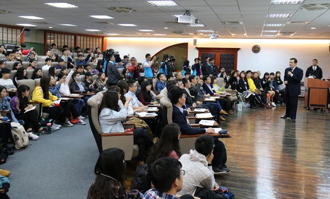 東吳大學自105學年度起禮聘前總統馬英九先生以榮譽無給職方式擔任「嚴家淦法學講座教授」,以每月1場不同主題的演講課程,與本校同學互動對談。本次馬英九講座教授本學期的第2場演講以「死刑存廢與國際法」為題,於4月17日上午在本校城中校區崇基樓實習法庭開講,校內師生報名踴躍熱情參與,現場座無虛席。