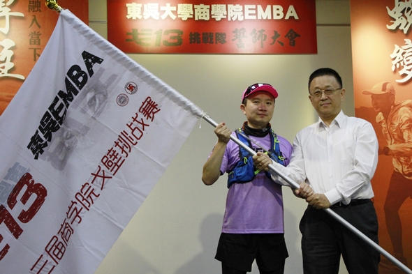 (今)107年4月21日於城中校區舉辦戈13挑戰賽誓師大會,由董保城副校長親自授旗予戈13黃彥瑋領隊,為參賽選手加油打氣。董副校長勉勵戈13團隊,實踐「養天地正氣」的精神,賽事重要的不是得到名次,而是大家攜手互助共同完成挑戰的過程,預祝團隊順利完成挑戰,再造顛峰。校友總會劉吉人理事長則表示,戈壁挑戰賽是一種自我成長的鍛鍊,短短兩年內東吳EMBA就已創下不得了的成就,期待未來能有更多校友一同共襄盛舉,參與一日挑戰賽。