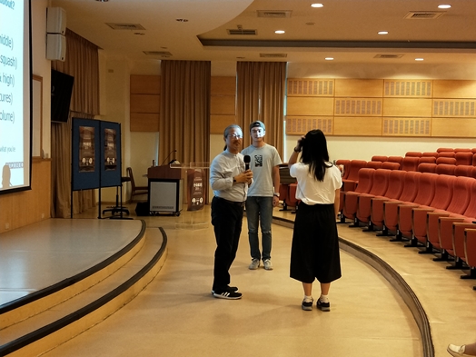 台上講者滔滔不絕地演講,後方口譯室的同學們聚精會神的進行同步的中英翻譯,透過連線傳到在場觀眾的耳機頻道。參與翻譯的英四C周立傑同學分享,練習同步口譯的過程。他說,ㄧ開始會跟不上速度,藉著大量練習文章和影片翻譯,逐漸找到自己的節奏。其中,最具挑戰的是笑話翻譯,因為東西方文化的不同,有時在語言轉換便會失去原有的幽默。英四C林佳蓁同學則表示,臨場反應很重要,在有限的時間內,若要將稿上沒有的單詞或成語傳達到位,必須趕緊用自己的方式換句話說,準確傳達講者要表達的概念。平時多練習英語聽力及口說,在中英表達上練習更有彈性的轉換,到現場翻譯時才能處變不驚。