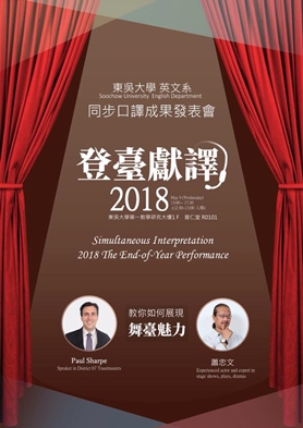 本校英文系年度盛事同步口譯成果展於107年5月9日星期三在外雙溪校區正式「登臺獻譯」,結合「教你如何展現舞台魅力」主題,邀請表演大師蕭忠文先生及演講能手Paul Sharpe先生分享在講台上如何吸引人的訣竅,同時進行「中譯英」與「英譯中」同步口譯。