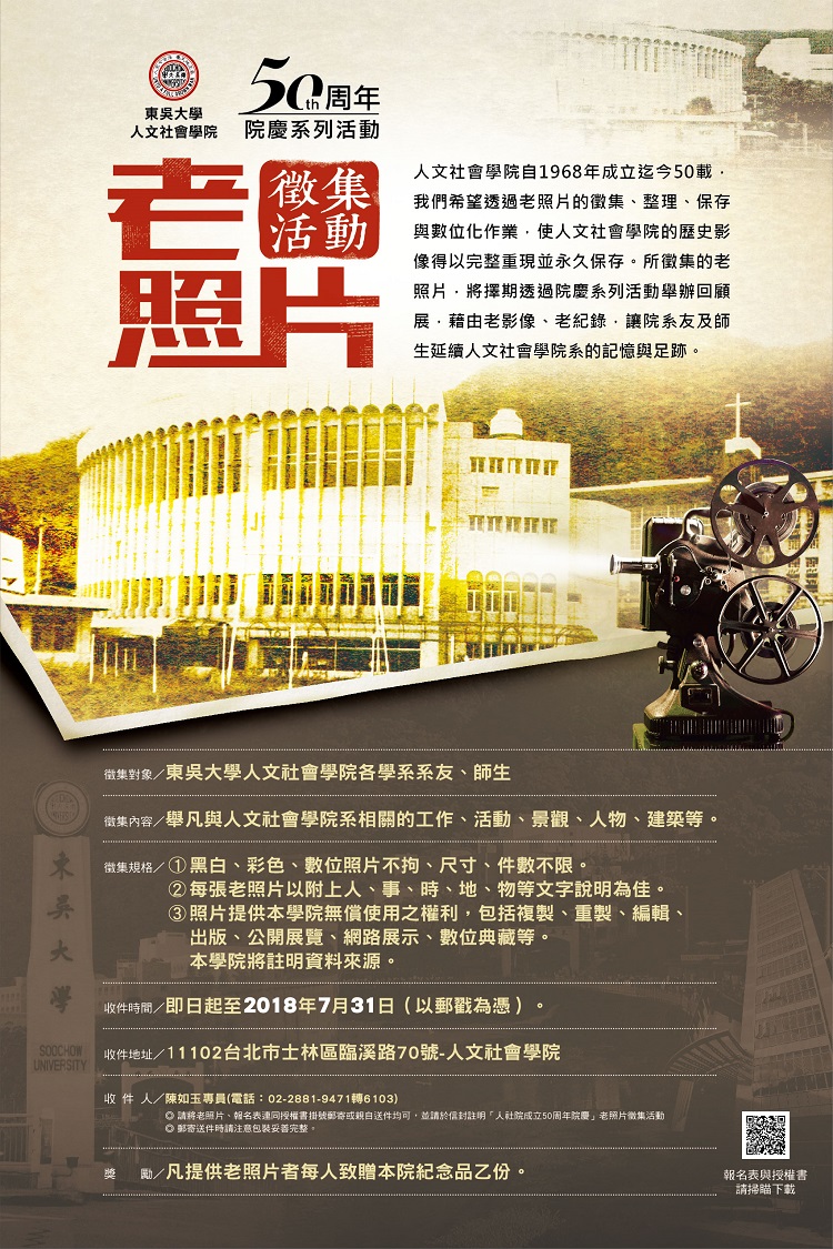 人文社會學院自1968年成立迄今50載,我們希望透過老照片的徵集、整理、保存與數位化作業,使人文社會學院的歷史影像得以完整重現並永久保存。所徵集的老照片,將擇期透過院慶系列活動舉辦回顧展,藉由老影像、老紀錄,讓院系友及師生延續人文社會學院系的記憶與足跡。