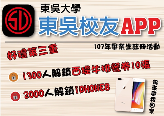 即日起107級應屆畢業生只要下載註冊「東吳校友APP」,還可享好禮三重送:註冊即送限定版紀念領帶或時尚絲巾(二選一)數量有限,送完為止;全班註冊達20人,購買畢業領巾享240元超佛心優惠;全校註冊滿2000人還抽Iphone8等大獎喔!為方便畢業生下載註冊「東吳校友APP」,6月16至17日畢業典禮兩日,校友資拓中心將於外雙溪校區望星廣場駐點服務,歡迎各位應屆畢業生踴躍下載「東吳校友APP」。