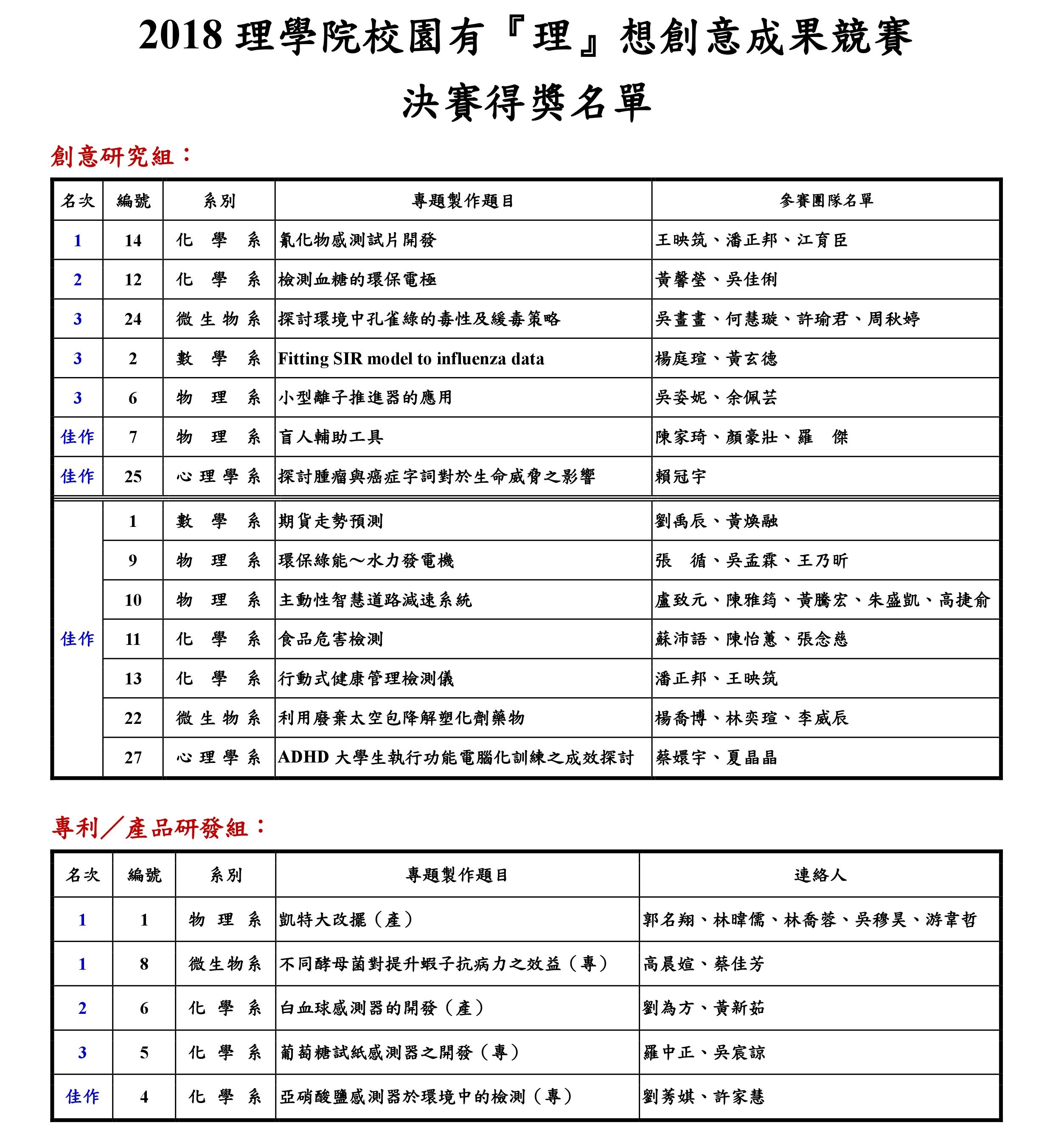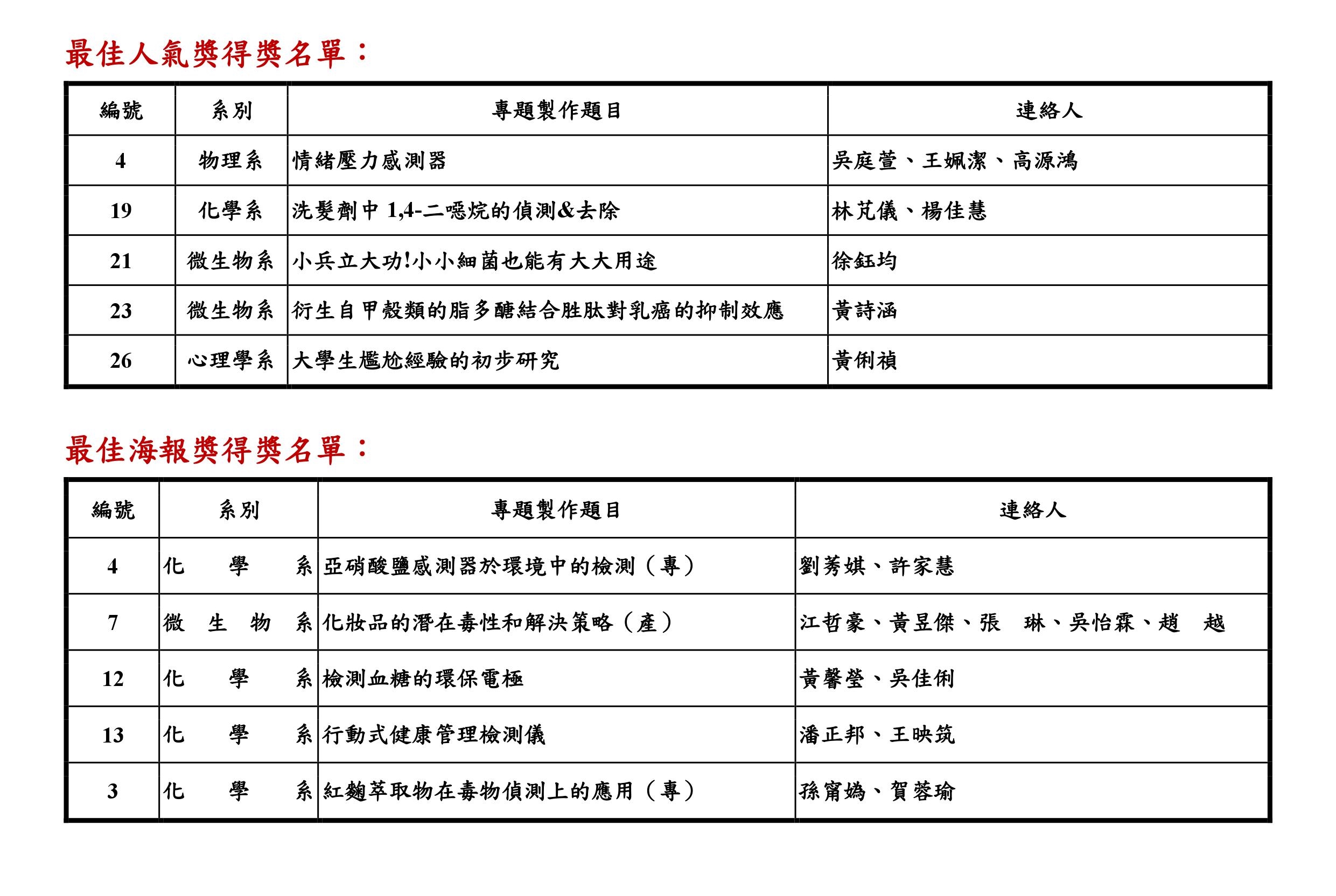 最後,創意研究組由化學系王映筑、潘正邦、江育臣同學的專題「氰化物感測試片開發」榮獲第一名,專利/產品研發組則是由物理系郭名翔、林暐儒、林喬蓉、吳穆昊、游韋哲同學的專題「凱特大改擺(產)」及微生物系高晨媗、蔡佳芳同學的專題「不同酵母菌對提升蝦子抗病力之效益」並列第一。此外,為了鼓勵同學們的參與熱情,本競賽除了各組評選出前三名及佳作外,亦頒發最佳人氣獎及最佳海報獎,鼓勵同學們能有更多的發想,日後能有更多創意作品產生。