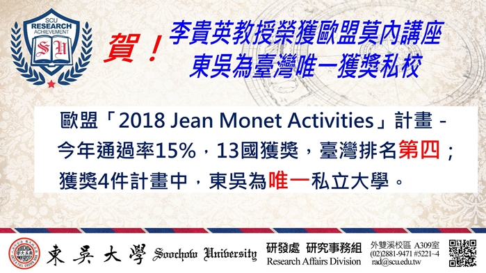 其中,本校法律系李貴英教授脫穎而出,以「設置東吳大學法學院莫內講座計畫」獲得歐盟未來三年(2018-2021年)的補助經費共3萬4,056歐元(折合新臺幣約126萬元),讓本校成為獲歐盟設置「莫內講座」(Jean Monnet Chair)之大學,李貴英教授也獲得莫內講座教授之終身榮譽。