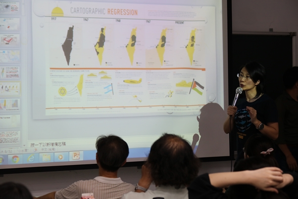 接著吳洛瑩、李隆揆記者透過他們前往加薩時拍攝的照片與影片,讓在座的師 生彷彿親身經歷炮火連天的現場。當他們到加薩走廊當地醫院採訪時,發現大多病人都是因為到以加邊境做了某些事(不一定是攻擊以色列的事情),便被以軍射傷下半身,其中一名青年更表示若傷好了仍會去邊境上遊行、抗議。即使加薩地區失業率高達60%,境內慘況也被聯合國組織評估為集中營,當地的人們仍堅信屬於自己的「應許之地」總有一天會回歸,因此在以加邊境的高牆上也有個看板,對內(加薩地區)寫著「這塊土地值得用血淚守護」,對外(以色列)「一個孩子犧牲了,我們就再生兩個!」鏡頭轉到西岸地區,當地的人民卻心靜如水,從前的抗爭與強烈的民族意識,在殘暴的對待折磨之下,他們如今已習慣槍聲砲擊的生活,彷彿已經走到了盡頭、無所盼望。