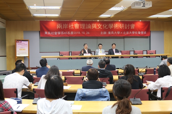 本校社會學系於今(107)年邁入第45周年的里程碑,為此特別舉辦一系列活動慶祝,以107年10月26日在外雙溪校區綜合大樓國際會議廳與北京大學社會學系合辦之「兩岸社會理論與文化」學術研討會作為開場,邀請本校潘維大校長、社會學系石計生主任及北京大學社會系教授劉能副主任共同揭開序幕。