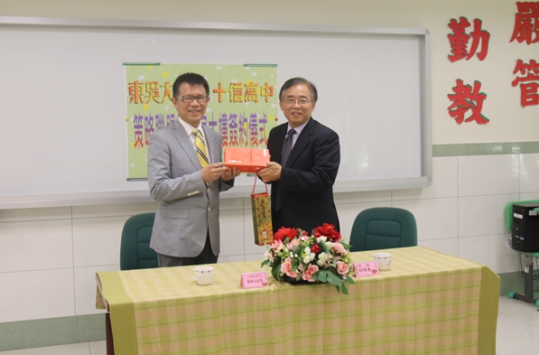 十信高中施博惠校長提及,兩校洽談合作過程一波三折,但好事多磨,期待未來雙方學生加強互動與交流。施校長特別致贈「彌月蛋糕」與「陳年高粱酒」,寓意就是希望兩校合作長長久久。簽約儀式後,施博惠校長帶領校長一行人,參觀十信高中校園。