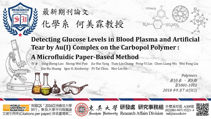 這項研究是由化學系何美霖教授與碩士班羅中正、張靝麟、楊家慧、林芃儀同學以及大學部吳宸諒、劉為方、黃新茹共同完成。我們使用金複合磷光材料設計出一個試紙為底的微流體分析裝置,通過添加抗凝血劑處理人血液後,可使葡萄糖從血液及淚液中分離並流入裝置後檢測出人體中血液及淚液葡萄糖,其線性檢測範圍分別為 1.0-50 mM以及 0.1-4.0 mM。