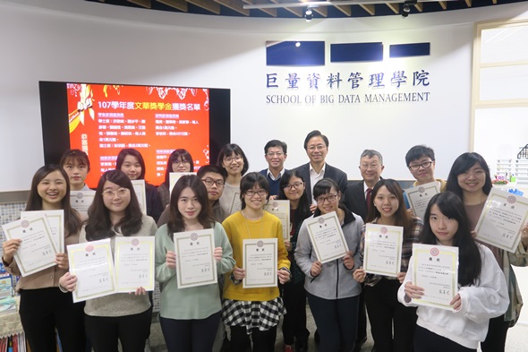 巨量資料管理學院「文華獎學金」第一屆頒獎典禮,於107年12月26日在雙溪校區哲生樓三樓H310研討室舉行。獎學金創辦人張善政講座教授兼榮譽院長親臨會場頒獎,趙維良副校長及許晉雄副院長亦到場觀禮。趙副校長並代表學校感謝張榮譽院長對巨量資料資料管理學院的支持與愛護。張榮譽院長致詞時表示,有感於東吳大學篤實的辦學精神及對巨量資料分析領域的前瞻規劃,他將人生第一筆的學校捐款給了本校,希望藉此拋磚引玉,鼓勵各界捐助本校推動大數據紮根教育。