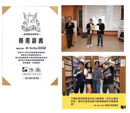 東吳實踐家創創基地樊學良執行長,帶領RB Rent Bowl智能化環保餐具團隊,獲政治大學創新育成中心創天使加速器與天使投資評審委員肯定,認定達天使輪投資推薦優選標準。團隊成員有英文系王郡、企管系張育誠、企管系陳孟萱、企管系易沛廷等4位同學。