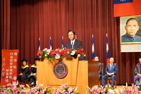 潘維大校長表示,未來社會將因大數據、生科、人工智慧這3項科技,顛覆既有的知識體系及架構,面對不斷變化的環境與社會,唯一的方法,就是持續學習,不要因為從學校畢業就停下學習的腳步。「世事洞明皆學問 人情練達即文章」潘校長期許畢業生都能秉持「關懷」的心,更以兩種心態勉勵畢業生,若是螞蟻的心態,任何的小石子都會是障礙;若是雄鷹的心態,任何高山都不是困難。