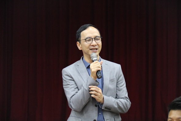 中華青年商會譚鎧承總團長為本校國貿系97級校友,他特別感謝母校在各方面給予的支援及提供的資源,此次他以總團長及校友的身分回到東吳,覺得就像是回到家一樣,分外親切。譚總團長以自身經驗分享,相較台灣其他大學,「東吳人」是頗具向心力及團結的,無論是學校對校友,或是校友之間的聯繫,都在在凸顯東吳人的深厚情誼;他也回應潘校長的發言,認為「學習」是青年人認識世界的方式,而藉由此次論壇,也希望能促進兩岸及國際上青年人的彼此交流。