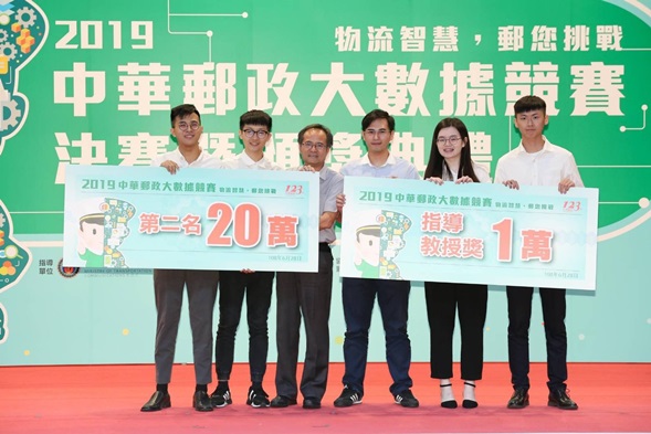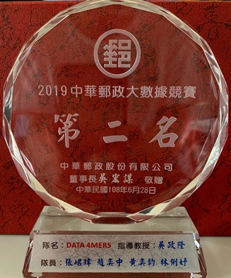 「2019中華郵政大數據競賽」自2019年2月19日至4月2日開放組隊報名,計有來自全國共77所大專院校、401隊報名,總參賽人數達1,413人,總獎金150萬元。本校巨量資料管理學院吳政隆老師帶領大學部學生張峮瑋、黃奕鈞、趙奕中及林俐妤組成「DATA 4MERS」團隊,以「告訴你哦,你的信明天十點到」作品,結合大數據分析、人工智慧技術及商業模式,設計出適合中華郵政之智慧型郵務模型,於2019年6月28日進行現場決賽,擊敗眾多國內頂尖大學的參賽隊伍,榮獲第2名佳績及獎金20萬元,為校爭光。