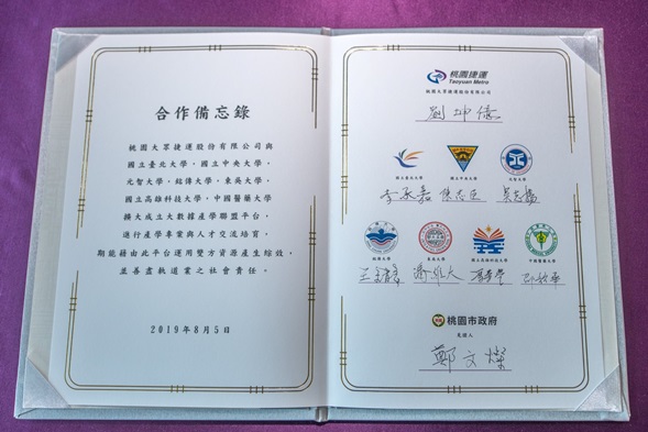 產學合作再創佳績!本校於8月5日在桃園市鄭文燦市長的見證下,與桃捷公司簽訂「大數據產學合作備忘錄」,未來將透過產學聯盟平台,與臺北大學、中央大學、元智大學、銘傳大學、高雄科技大學、中國醫藥大學等校,運用大數據精確分析,提供桃捷公司更智慧化的判讀營運服務及設備維修的相關數字,以提升服務品質、降低維修成本、培養國產化能力。
