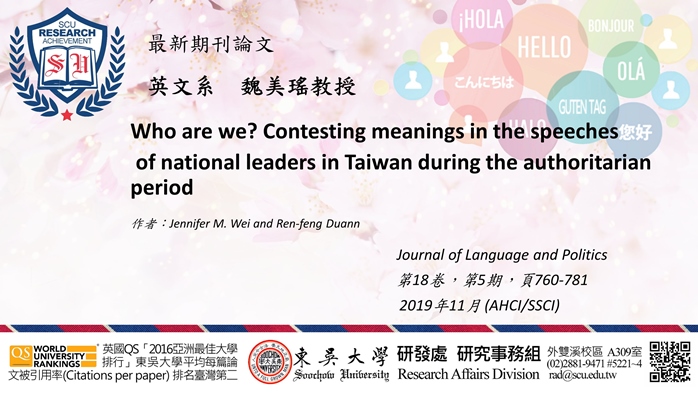 (研究事務組小提醒)教師如有最新發表於AHCI、SSCI、SCI、EI、TSSCI、THCI、「東吳大學外語學門獎勵名單」之期刊論文,歡迎將相關資訊e-mail至rad@scu.edu.tw,研究發展處將會公告於校園頭條,以廣交流。