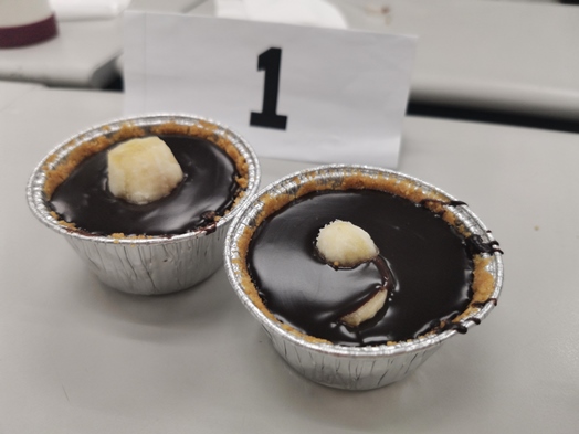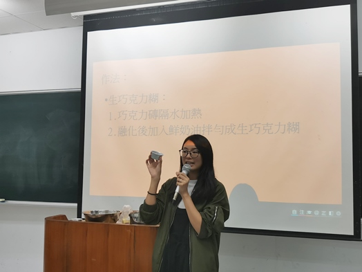 活動開始,便有學生提出在教室沒有烤箱如何做甜點的疑惑。東吳榮耀團契的社團指導老師玟潔給予回應,清晰且有條理地介紹了法式生巧克力塔的製作原料及步驟。其所需原料僅為:生巧克力、奶油、消化餅乾及盛裝器具,且製作過程非常簡單。學生們按照步驟,將奶油融化後拌入消化餅乾並捏碎至糊狀,再以小湯匙勺出糊狀的餅乾,在小杯中壓成塔狀,最後注入生巧克力即完成。學生們紛紛表示手作無難度,製作的同時,更大方地與組員分享生活趣事,其樂融融。