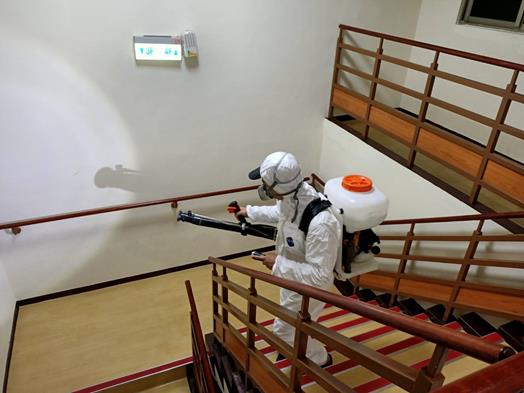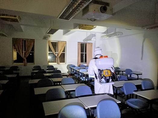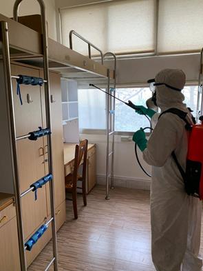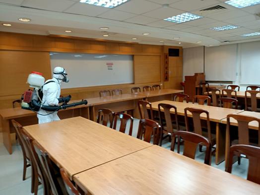 為維護師生健康及避免校園群聚感染,本校於開學前夕進行全面大消毒作業,安排清潔消毒公司於楓雅學院、松勁樓、榕華樓、柚芳樓等校內宿舍及合江、合楓、合樂及泉思學舍等校外宿舍徹底落實消毒,讓學子們能安心返宿;兩校區各樓層教室、會議室、體育館、圖書館、電腦教室及機車停車場等公共區域也逐一完成消毒工作,城中校區消毒工作更是執行至凌晨三點鐘,以嚴謹紮實的防疫措施築起校園安全防線。